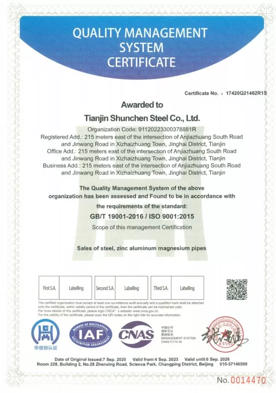 Công ty Công nghiệp Shunchen Thiên Tân đã tích lũy được hơn ba thập kỷ kinh nghiệm sản xuất trong ngành thép. Công ty có chứng nhận hệ thống ISO 9000, 3A cũng như chứng nhận CE của Liên minh Châu Âu và đã thiết lập bố cục chuỗi công nghiệp đầy đủ từ xử lý mạ kẽm đến bán hàng và phân phối. Thông qua quy trình 12 bước nghiêm ngặt và cơ chế kiểm tra toàn diện ba cấp, công ty đã đạt kỷ lục không có tai nạn về chất lượng và an toàn hàng năm cũng như không có sai sót trật tự nào trong 12 năm liên tiếp. Shunchen Industrial duy trì lượng tồn kho thép mạ kẽm quanh năm trên 20.000 tấn, hình thành một siêu thị thép mạ kẽm quy mô lớn tích hợp kho bãi và phân phối. Nhà kho có diện tích 10.000 mét vuông, hỗ trợ vững chắc cho dịch vụ sản xuất và bán hàng tích hợp.