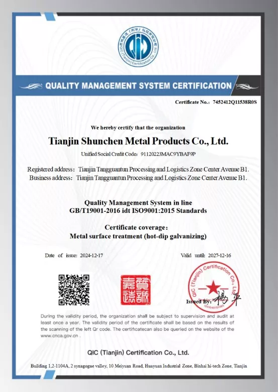 Chọn Shunchen để có chất lượng đáng tin cậy. Chúng tôi sử dụng thép chất lượng cao Q235B hoặc Q355B, được xử lý qua mạ kẽm nhúng nóng để chống ăn mòn. Nhiệt độ của nồi kẽm được kiểm soát chính xác trong khoảng 450-460 độ C đảm bảo độ bám dính chắc chắn của lớp mạ kẽm và không bỏ sót chỗ nào. Sản phẩm của chúng tôi tuân thủ chứng nhận hệ thống chất lượng ISO9001 và được hỗ trợ bởi các báo cáo kiểm tra lớp phủ kẽm của bên thứ ba.